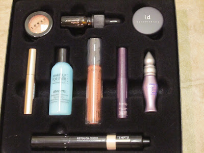 - 0.17 oz Anastasia Beverly Hills Brow Gel - 0.06 oz Lorac Eye Shadow in Serenity (shimmering bronze) - 0.17 oz Josie Maran Organic Argan Oil - 0.1 oz Tarte Lights, Camera, Lashes! Mascara - 0.84 oz Make Up For Ever Sens'Eyes Waterproof Sensitive Eye Cleanser - 0.13 oz Urban Decay Eyeshadow Primer Potion - 0.02 oz bareMinerals All-Over Face Color in Glee - 0.14 oz bareMinerals Sugar Cookie Lip Gloss (shimmering pink) - 0.05 oz Temptu Retouch Powder |