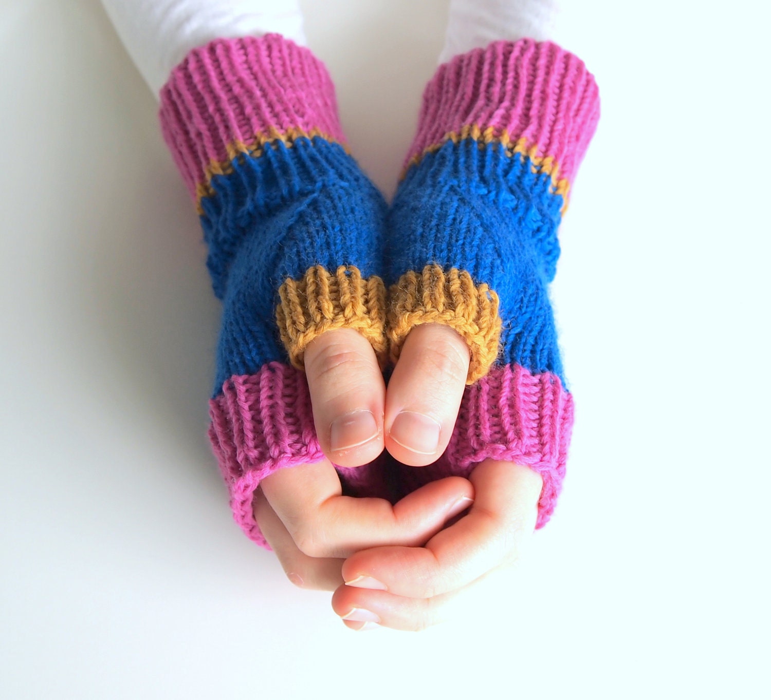 Pink Blue Ocre knit fingerless gloves